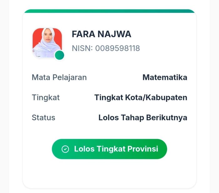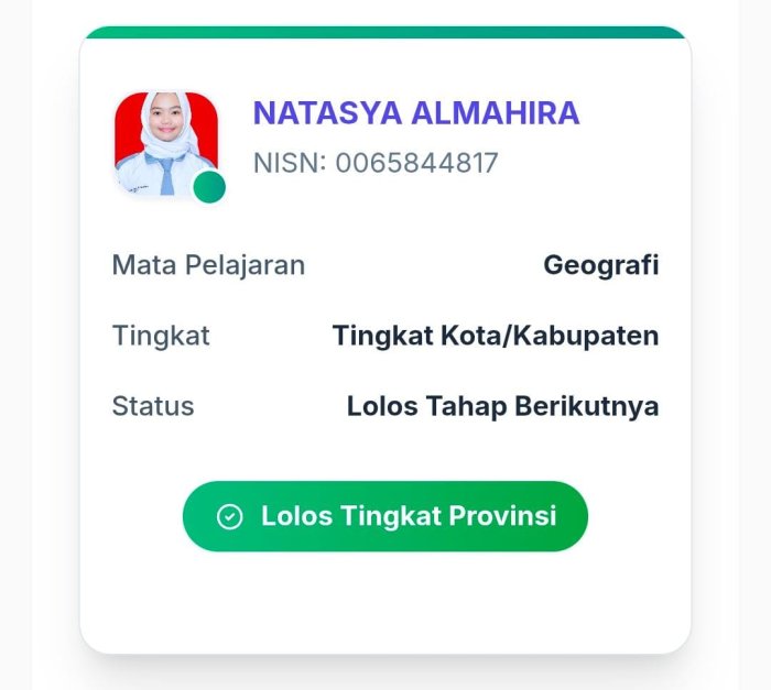 Keempat siswa tersebut adalah Fara Najwa dan Naila Nur Aulia yang berjaya di bidang Matematika, Chintia Bella di bidang Fisika, serta Natasya Almahera di bidang Geografi. Keberhasilan mereka mencerminkan dedikasi, kerja keras, dan semangat juang yang luar biasa dalam mengasah kemampuan akademik.