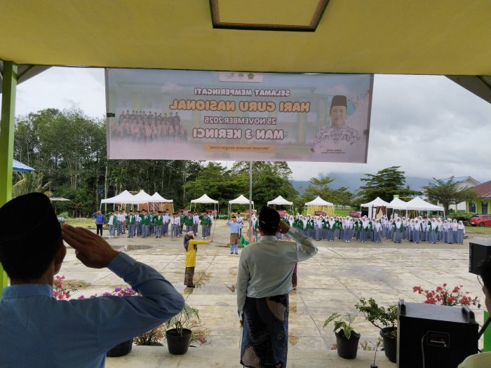 Manega Kerinci – Madrasah Aliyah Negeri (MAN) 3 Kerinci melaksanakan upacara bendera dalam rangka memperingati Hari Guru Nasional (HGN) yang jatuh setiap tanggal 25 November. Upacara khidmat ini digelar di lapangan madrasah dan diikuti oleh seluruh dewan guru, staf tata usaha, serta peserta didik.