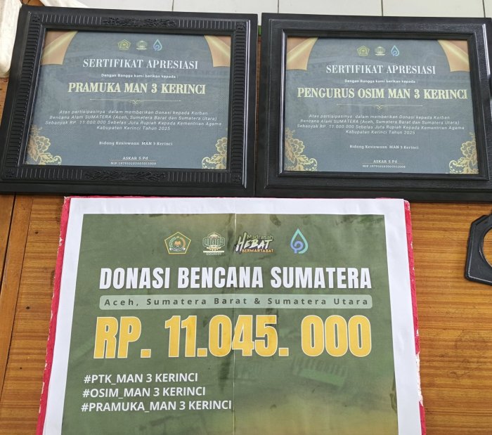 Berkat partisipasi aktif dari seluruh warga madrasah dan para dermawan, jumlah donasi yang berhasil terkumpul mencapai angka fantastis Rp11.045.000,00 (Sebelas Juta Empat Puluh Lima Ribu Rupiah). Doa Terbaik untuk Dermawan dan Korban Kepala MAN 3 Kerinci, melalui perwakilan pengurus OSIM dan Pramuka, menyampaikan ucapan terima kasih tak terhingga."Alhamdulillah, kami sampaikan terima kasih sebesar-besarnya kepada seluruh dermawan yang telah menyumbang. Semoga rezeki yang telah dikeluarkan dimurahkan dan dibalas dengan balasan berlipat ganda oleh Allah SWT," ujar Priyoga, mewakili osim dan pramuka. "Dan untuk saudara-saudara kita yang tertimpa musibah, semoga diberikan kekuatan, kesabaran, dan keteguhan dalam menghadapi cobaan ini. Amiiin yaa Rabbal 'alamiin."