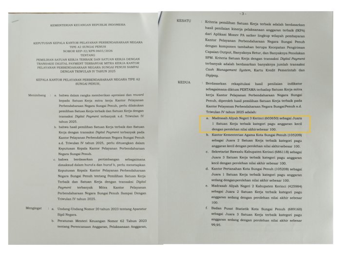 Manega Kerinci - Madrasah Aliyah Negeri (MAN) 3 Kerinci kembali mencatat prestasi membanggakan pada akhir tahun anggaran 2025. MAN 3 Kerinci berhasil meraih peringkat pertama sebagai Satuan Kerja (Satker) Terbaik dalam Penilaian Indikator Kinerja Pelaksanaan Anggaran (IKPA) Triwulan IV Tahun 2025 untuk kategori Satker Pagu Kecil di lingkungan Kantor Pelayanan Perbendaharaan Negara (KPPN) Sungai Penuh.